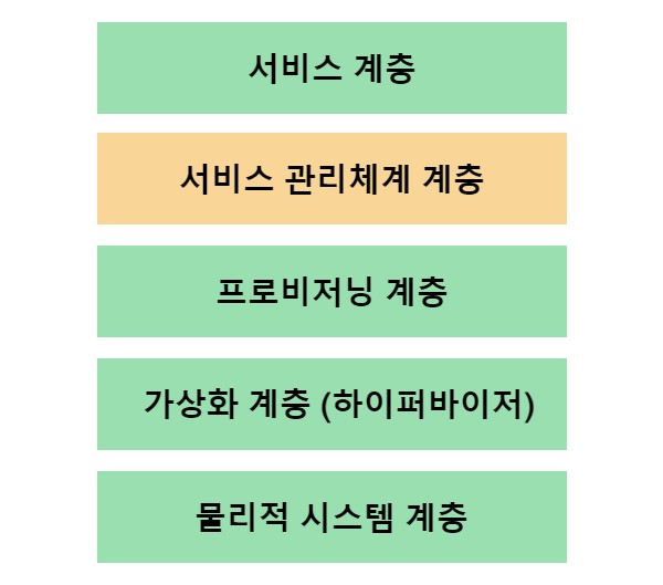 - 클라우드 제공자(Vendor) 영역: 물리적 시스템 계층, 가상화 계층, 프로비저닝 계층, 서비스 계층