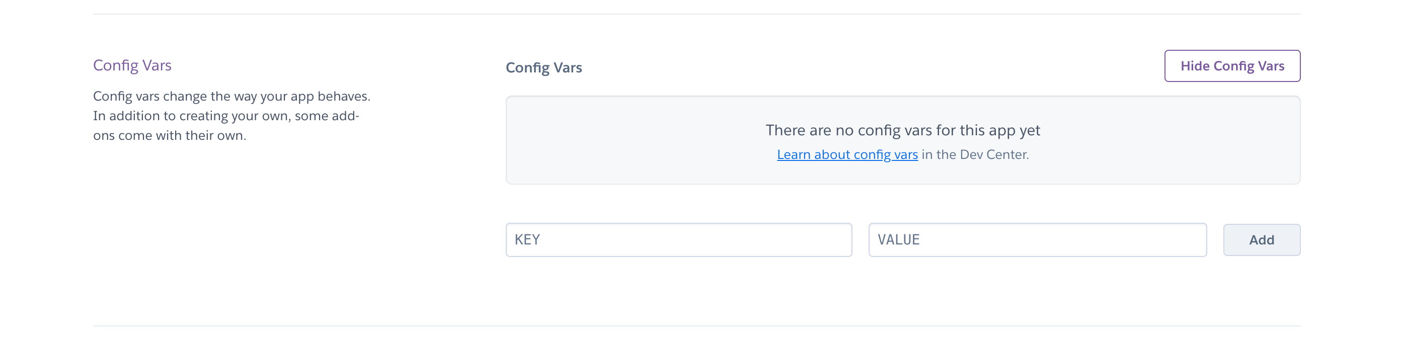 8. .env에 사용하는 Api key 등이 있다면 Heroku에도 알려주어야 한다. 메뉴-Settings-Config Vars에 등록해준다.