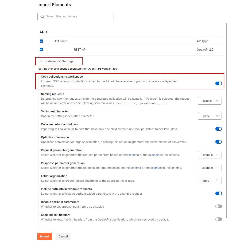 Collections에 세팅하고 싶다면 아래와 같이 Settings를 열고 Copy collections to workspace의 옵션을 켜주어야 한다.
