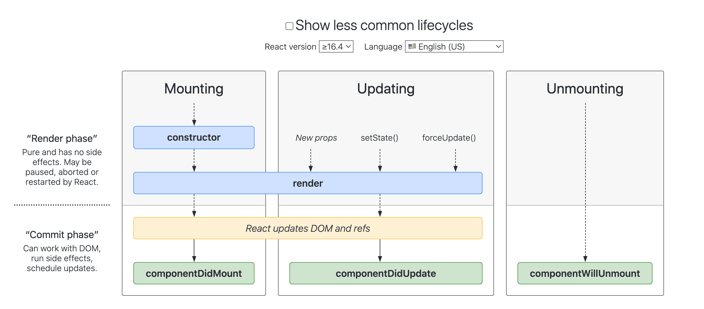 아래 도표는 리액트의 Lifecycle(생명주기)를 나타낸다. componentWillMount(), componentDidMount()등 Lifecycle에 정의된 메서드는 함수형 컴포넌트에서만 사용이 가능하다.