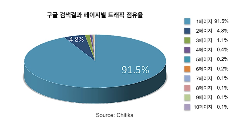 구글 내에서도 알아야할 중요한 사실이 있다. 아래 도표를 살펴보면, 91.5%의 트래픽이 첫 번째 페이지에 쏠려있다는 것을 알 수 있다. 첫 페이지 안에서도 게재된 순서에 따라 트래픽이 많이 차이 난다. 그만큼 첫 페이지, 상위 노출이 잠재고객을 얻기에 매우 중요한 요소인 것이다. 결론적으로 웹사이트를 운영하고자 한다면 구글 상위 노출은 절대 무시할 수 없는 요소가 되었다.