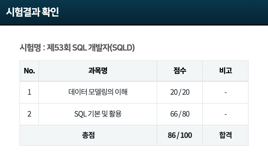 1과목 만점이고, 2과목에서 66점을 받아 총점 86점으로 합격했다.