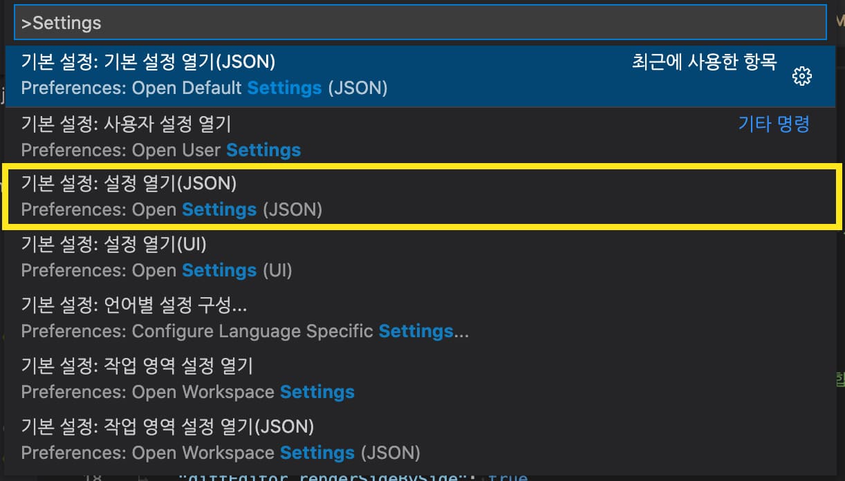 2) 검색창에 'Settings'를 입력한 뒤, Preference: Open Settings (JSON)을 선택한다.